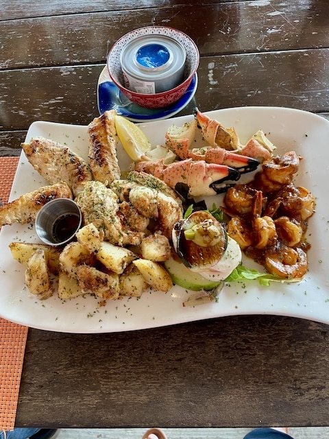 The previous day we decided to brave the rain and drive up to Hatchet Bay to the Front Porch for a nice leisurely lunch as an early celebration of Bob’s birthday. Of course we were the only ones there and the roads were pretty much deserted. We had a delicious seafood platter which included stone crab claws , lobster , curried shrimp and red snapper – plus some fabulous potatoes …….