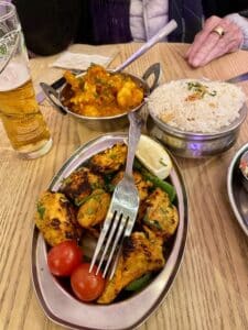 Tandoori chicken tikka and prawn bhuna with rice and Peshawar naan bread