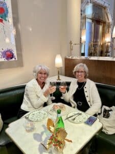 While they were doing that I met up with my dear sister Jane in central London and took her to a lovely restaurant in Claridges for a birthday lunch. In fact it was her 70th birthday the following day but we celebrated in style with a delicious glass of champagne and rounded the lunch off with a complementary birthday desert. Thank you Claridges ! Afterwards we did a little light shopping – I had forgotten how busy central London is on a rainy Saturday afternoon 4 weeks before Christmas. But we had a great time before parting late afternoon…… To have this time with her was very precious – just the 2 of us enjoying a few hours together.